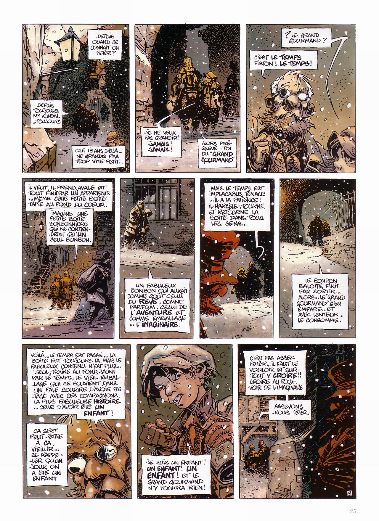 Imagine une petite boîte bonbonnière qui ne contiendrait qu’un seul bonbon. Un fabuleux bonbon qui aurait comme goût celui du rêve, comme parfum, celui de l’aventure et comme emballage… l’imaginaire. Mais le temps est implacable, tenace… Il a la patience : il harcèle, tourne, et retourne la boîte dans tous les sens… Le bonbon balotte [sic], finit par sortir… alors… le "grand gourmand" s’en empare… et avec lenteur… le consomme. Voilà… Le temps est passé… La boîte est toujours là. Mais le fabuleux contenu n’est plus… Seul, traîne au fond, jauni par le temps, le vieil emballage qui se souvient dans un pâle sourire d’avoir partagé avec ses compagnons, la plus fabuleuse histoire. … Celle d’avoir été un enfant ! Ça sert peut-être à ça, vieillir… Se rappeler qu’un jour on a été un enfant.