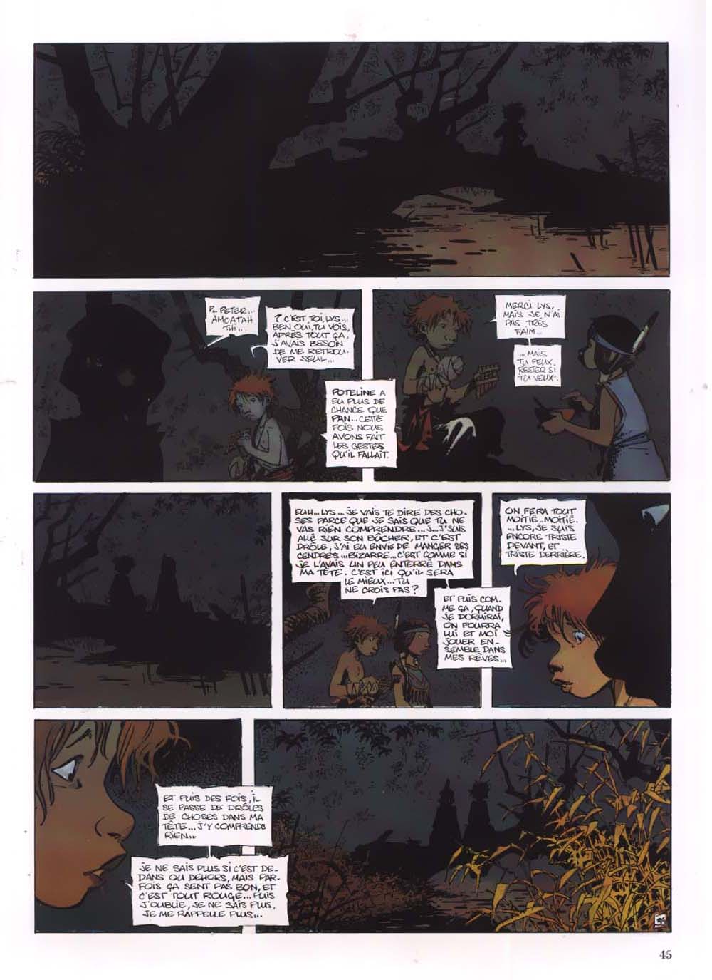 Euh… Lys… Je vais te dire des choses parce que je sais que tu ne vas rien comprendre… J… J’suis allé sur son bûcher, et c’est drôle, j’ai eu envie de manger ses cendres… Bizarre… C’est comme si je l’avais un peu enterré dans ma tête. C’est ici qu’il sera le mieux… Tu ne croix pas ? Et puis comme ça, quand je dormirai, on pourra lui et moi jouer ensemble dans mes rêves… On fera tout moitié-moitié… Lys, je suis encore triste devant, et triste derrière. Et puis des fois, il se passe de drôles de choses dans ma tête… J’y comprend rien… Je ne sais plus si c’est dedans ou dehors, mais parfois ça sent pas bon, et c’est tout rouge… Puis j’oublie, je ne sais plus, je me rappelle plus…