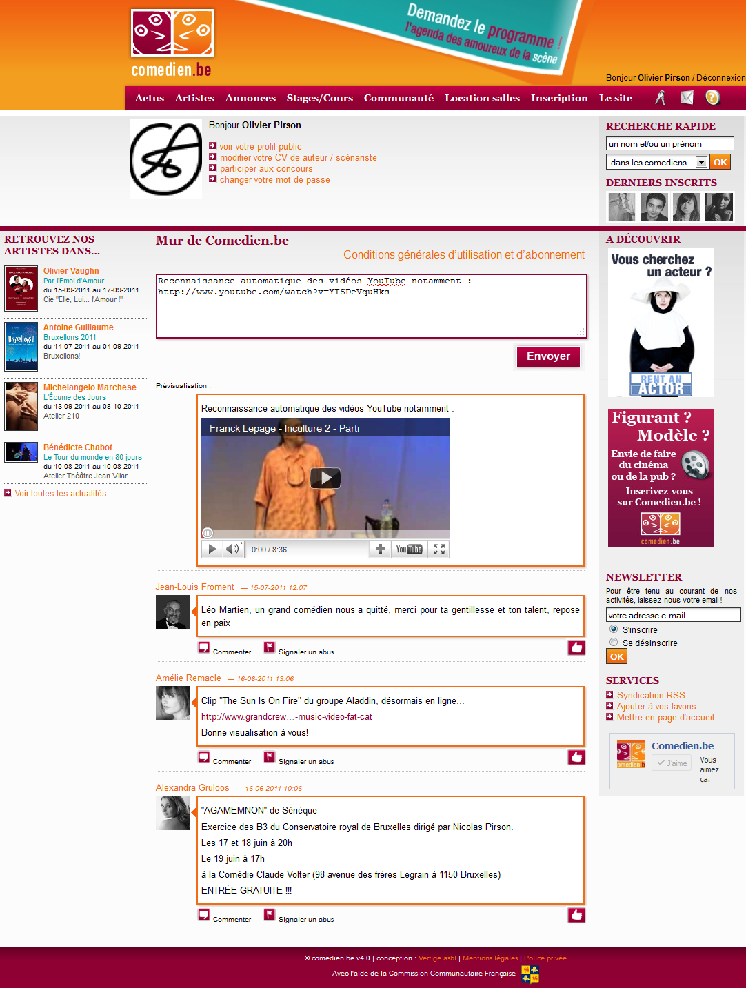 - Analyse, développement web full stack (MySQL, PHP, HTML/CSS, JavaScript) et déploiement d’un "mur à la Facebook" pour le site web Comedien.be utilisant le CMS SPIP. Screenshot du mur : www.opimedia.be/CV/2010_Vertige/Comedien_be/Mur_de_Comedien_be.png