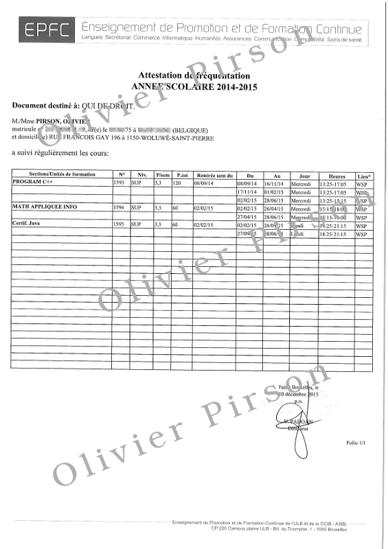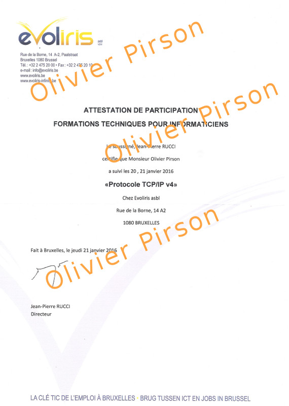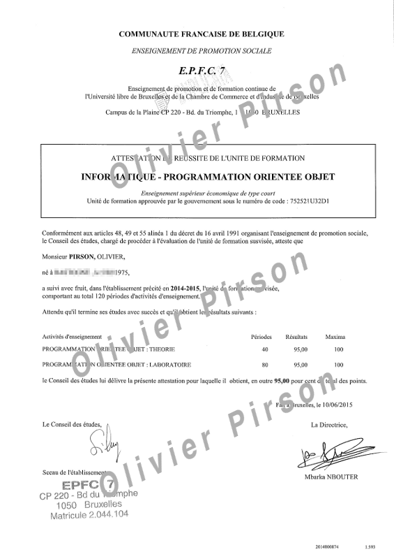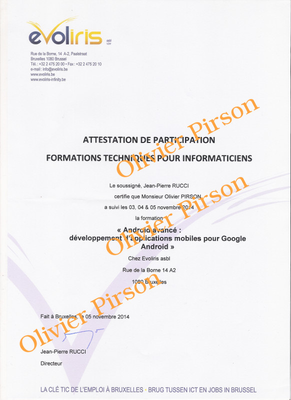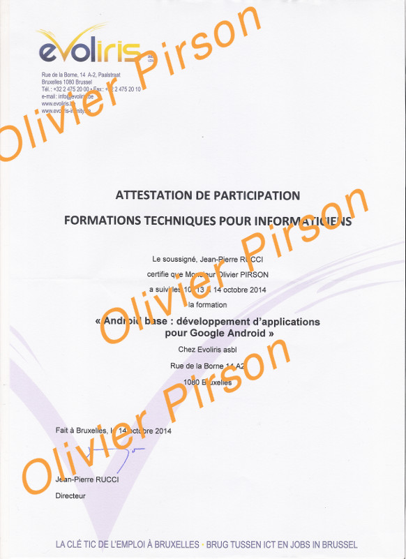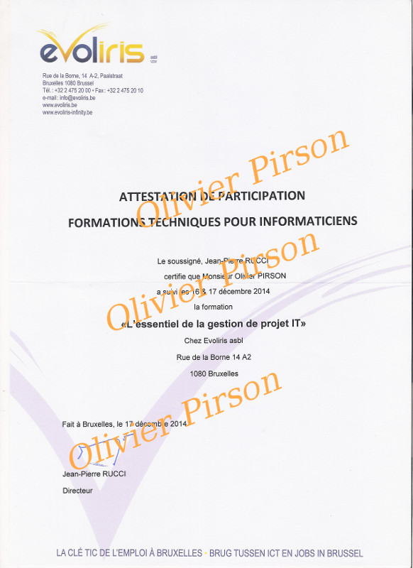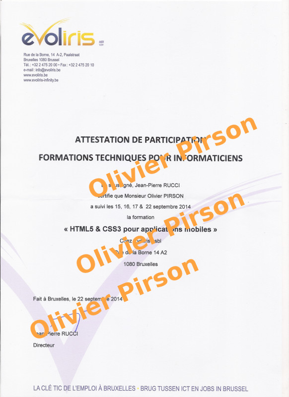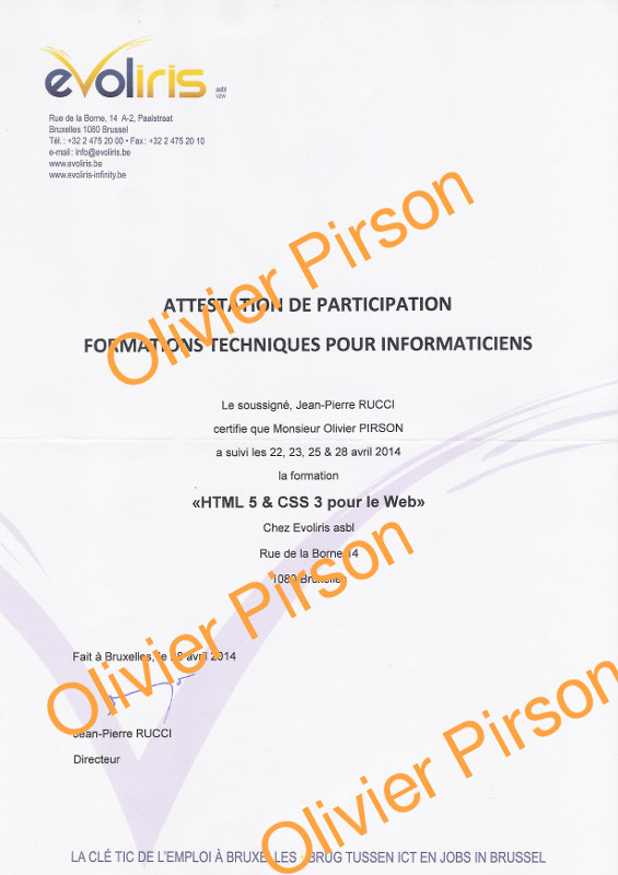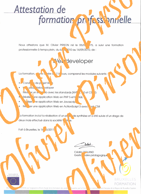 Formation professionnelle de développeur Web 🌐 (Tarek Elfaleh, Benoît Baugniet, Ghazi Boujnah, Kristiaan De Greef) organisée par Business Training via Bruxelles Formation (Attestation de formation professionnelle) : UML, (X)HTML/CSS, MySQL, PHP, JavaScript, Flash/ActionScript.